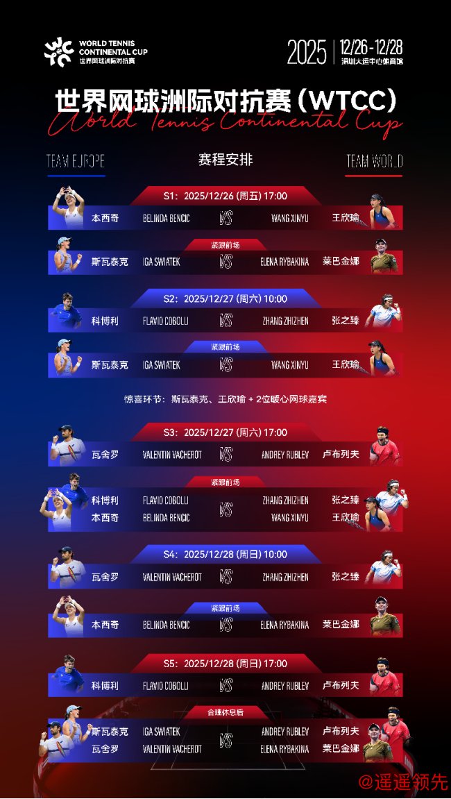 北京时间12月26日,2025世界网球洲际对抗赛(WTCC)在深圳大运中心体育馆震撼开幕!两位大满贯冠军斯瓦泰克、莱巴金娜领衔,中国网球明星王欣瑜、张之臻,以及卢布列夫、本西奇、科博利、瓦舍罗一众网坛实力悍将齐聚深圳星空体育官网下载,为全世界球迷献上一场精彩绝伦的网球年终盛宴。