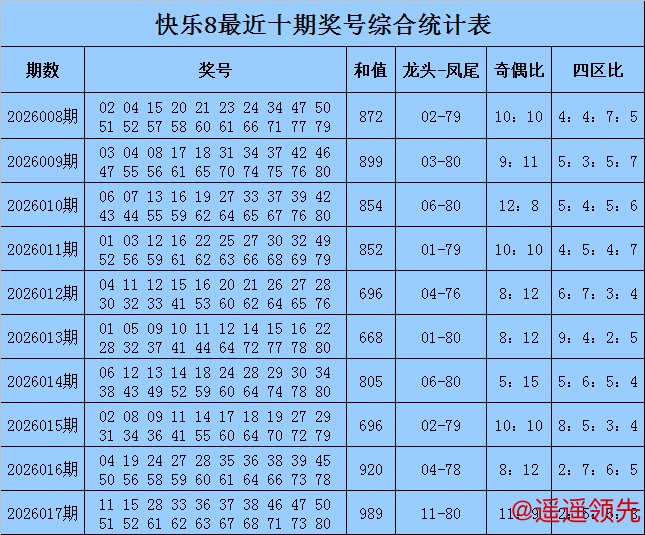 福彩快乐8第2026017期开奖回顾:11 15 28 33 36 37 38 46 47 50 51 52 61 62 63 67 68 71 73 80,其中奖号和值为989,跨度为69,奇偶比开出11:9,012路比开出5:7:8,四区比开出2:5:5:8。